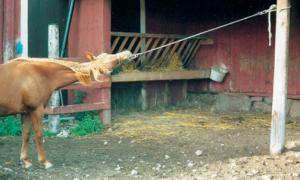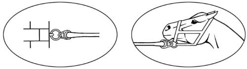 Om du har en häst som är ”svår” att binda upp så använd dubbla rep med ett i varje sida tills den lärt sig.