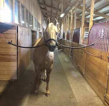 Bilden visar häst under inlärning. Två st 50 rep de första gångerna bunden intill en plan vägg. Ett täcke hänger på väggen för att det ska vara så skonsamt som möjligt för hästen. Grimmorna håller längre.