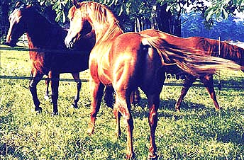 Två gröna elband skiljer de här hästarna åt som är hingst och ston och det fungerar bra men det bästa är om man kan ha hagarna en bit ifrån varandra med ett mellanrum. Därför att man ska undvika att hästarna slår med frambenen så att de fastnar eller river ner staketet.