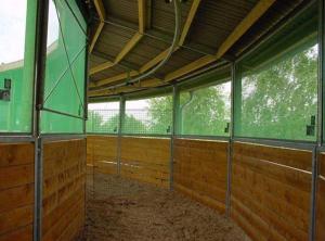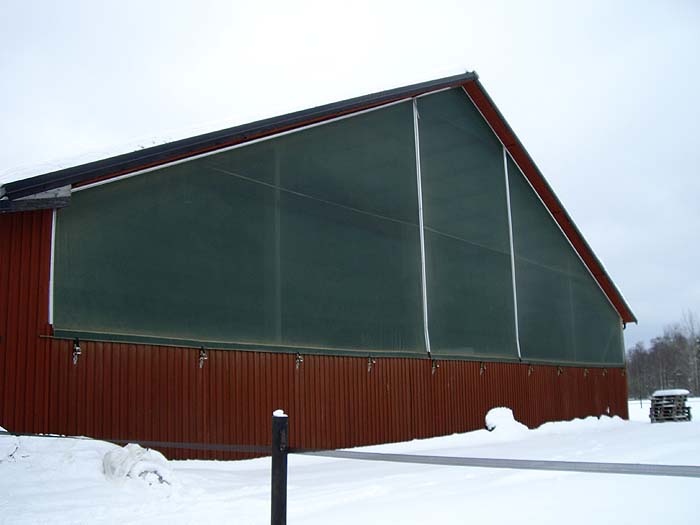 Vindnätet är här spänt på hela gaveln. Man kan få vindnätet i önskad höjd och ända upp till 30 meters bredd. Det finns en mängd tillbehör som rullportar, sidor att rulla upp, manuellt eller automatiskt mm.