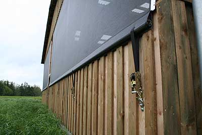 Vindnätet är här spänt på hela gaveln. Man kan få vindnätet i önskad höjd och ända upp till 30 meters bredd. Det finns en mängd tillbehör som rullportar, sidor att rulla upp, manuellt eller automatiskt mm.